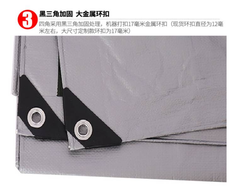 雙銀色PE防水篷布黑三角加固,大金屬環扣:四角采用黑三角加固處理,機器打扣17毫米金屬環扣(現貨環扣直徑為12毫米左右,大尺寸定制款環扣為17毫米)
